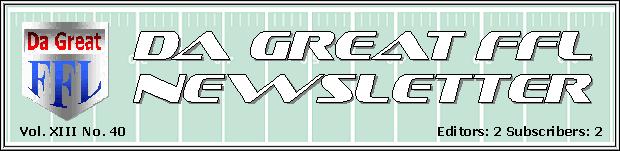 While we are on the subject of grandiloquent platitudes, we offer kudos and our heartfelt trepidation towards the Dynamic Diabolists of DDTs Goalline Wizzzards, who, as we near the season’s halfway point, currently lies undefeated, untied and unruffled. Scoring a blazing 124 points a game, the current StuporBowl™ champs are making a mockery out of, admittedly, a mockery. The Stupendous Sorcerers have a solid lineup with very few weaknesses and they are the odds on favorite to be the first DaGFFL team to repeat as StuporBowl™ Champs! (Well, that should instill the dreaded Newsletter Curse™- Ed)