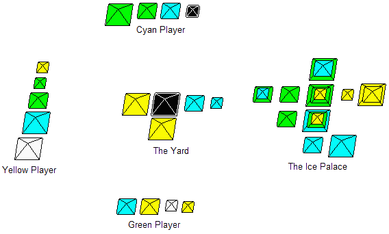 Each player determines their score by totalling the number of pyramids in the Ice Palace that have their own color as the top pyramid in a stack. Ice Palace (C) 2004 Geoff Hanna   |