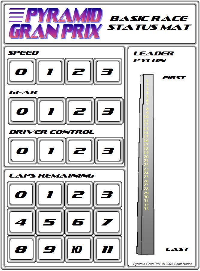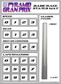 Each player provides five pyramids of their color to serve as status markers. Pyramid size is not important but everyone should save at least two pyramids of each size for game play. Stack one pyramid of each color in the gear and speed indicated by the selected starting method (for Standing Starts, do not place speed or gear markers until the player succeeds at the first driver check). Stack another pyramid of each color in Driver Control space 3. Another stack goes into the Laps section. For a five-lap race, begin the stack in space 5. The final pyramid is not stacked, but lined up in the Leader Pylon section in the order of each car's starting position, from first place to last. Multiple Mats (when there are more cars than colors) The race may contain more cars than there are separate pyramid colors. For the cars themselves this is not much of a drawback. All players spend much of the time examining the track and it is not difficult to remember which car is which. But the status markers are not so easily identified. To solve this problem, use more than one Basic Race Status Mat. The first Black car is tracked on the first status mat, the second Black car on the second mat, and so on. Note that everyone must share one Leader Pylon: you will need to identify same-colored pyramids by size or some other method such as tape on one of the pyramids. |
